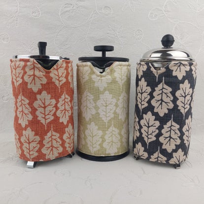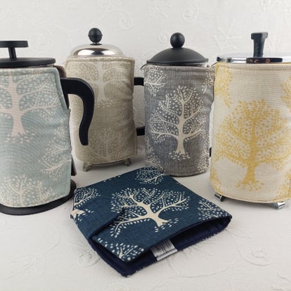 Great Oak Trees cafetiere cosy wrap-around jacket for French Press filter coffee makers. Cotton fabric outer, with thermal insulation wadding inside, and Velcro fastening tab for easy adjustment. A stylish kitchen, dining home décor accessory and a great gift idea.