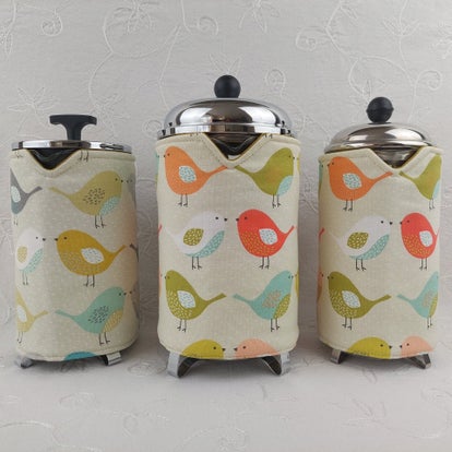 Duck Egg Beautiful birds cafetiere cosy wrap-around jacket for French Press filter coffee makers. Cotton fabric outer, with thermal insulation wadding inside, and Velcro fastening tab for easy adjustment. A stylish kitchen, dining home décor accessory and a great gift idea.