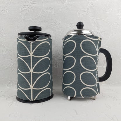 Kelmscott cafetiere cosy wrap-around jacket for French Press filter coffee makers. Cotton fabric outer, with thermal insulation wadding inside, and Velcro fastening tab for easy adjustment. A stylish kitchen, dining home décor accessory and a great gift idea.