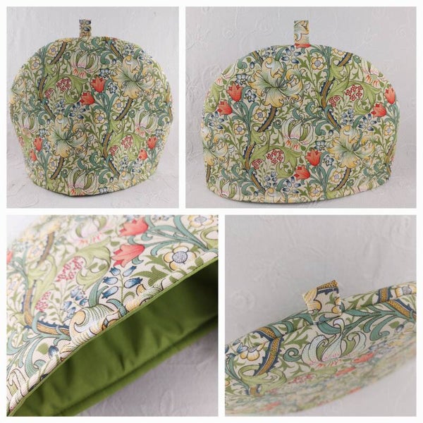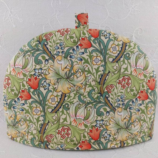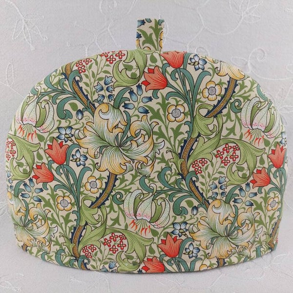 William Morris Fabric Tea Cosy. Golden Lily, first produced in 1897. With cotton lining and polyester insulation wadding inside to help keep your cuppa warm. Teapot cosies make great gifts and stylish cozy kitchen home decoration accessories.
