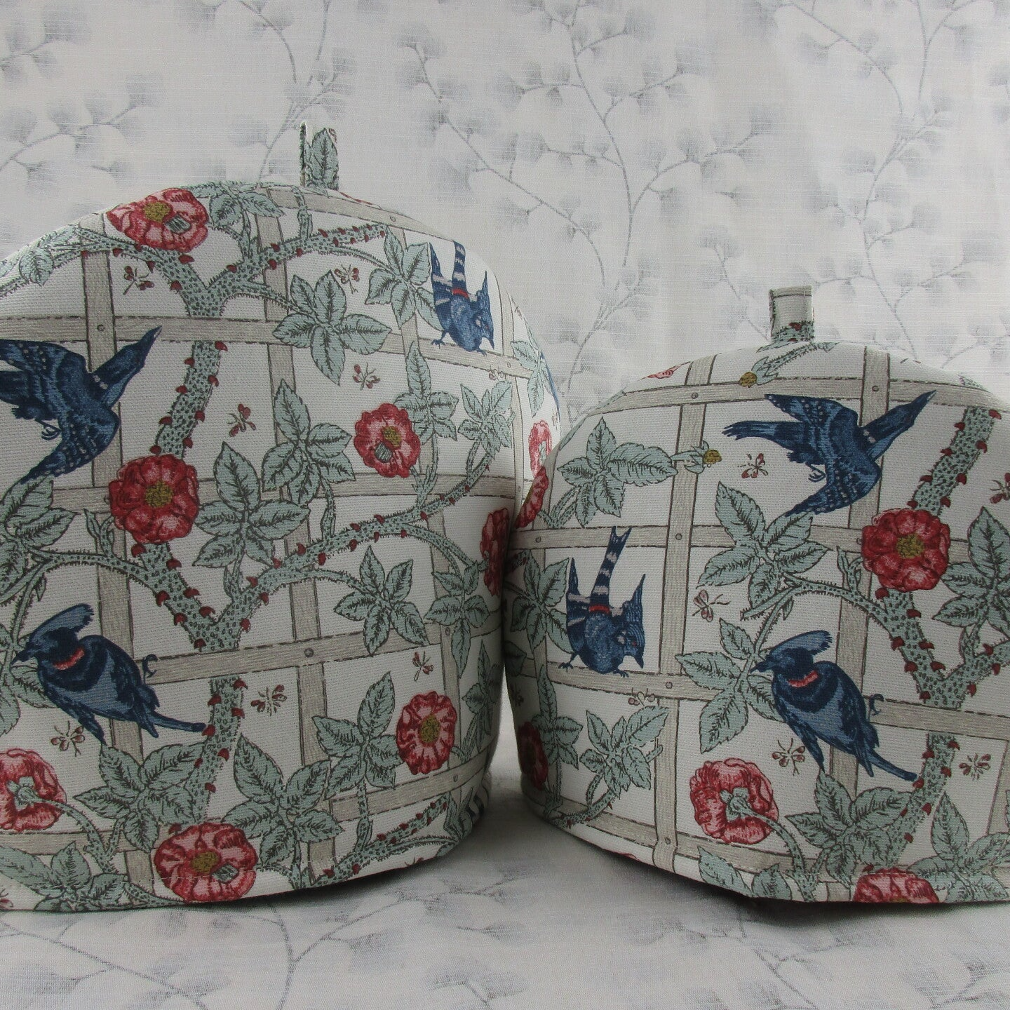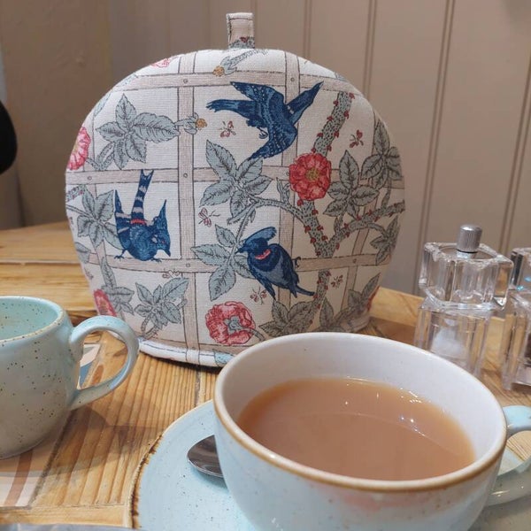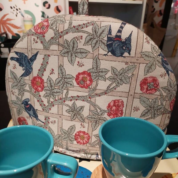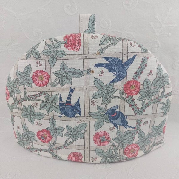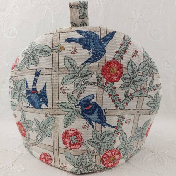 William Morris Fabric Tea Cosy. Trellis and birds, first produced in 1864. With cotton lining and polyester insulation wadding inside to help keep your cuppa warm. Teapot cosies make great gifts and stylish cozy kitchen home decoration accessories.
