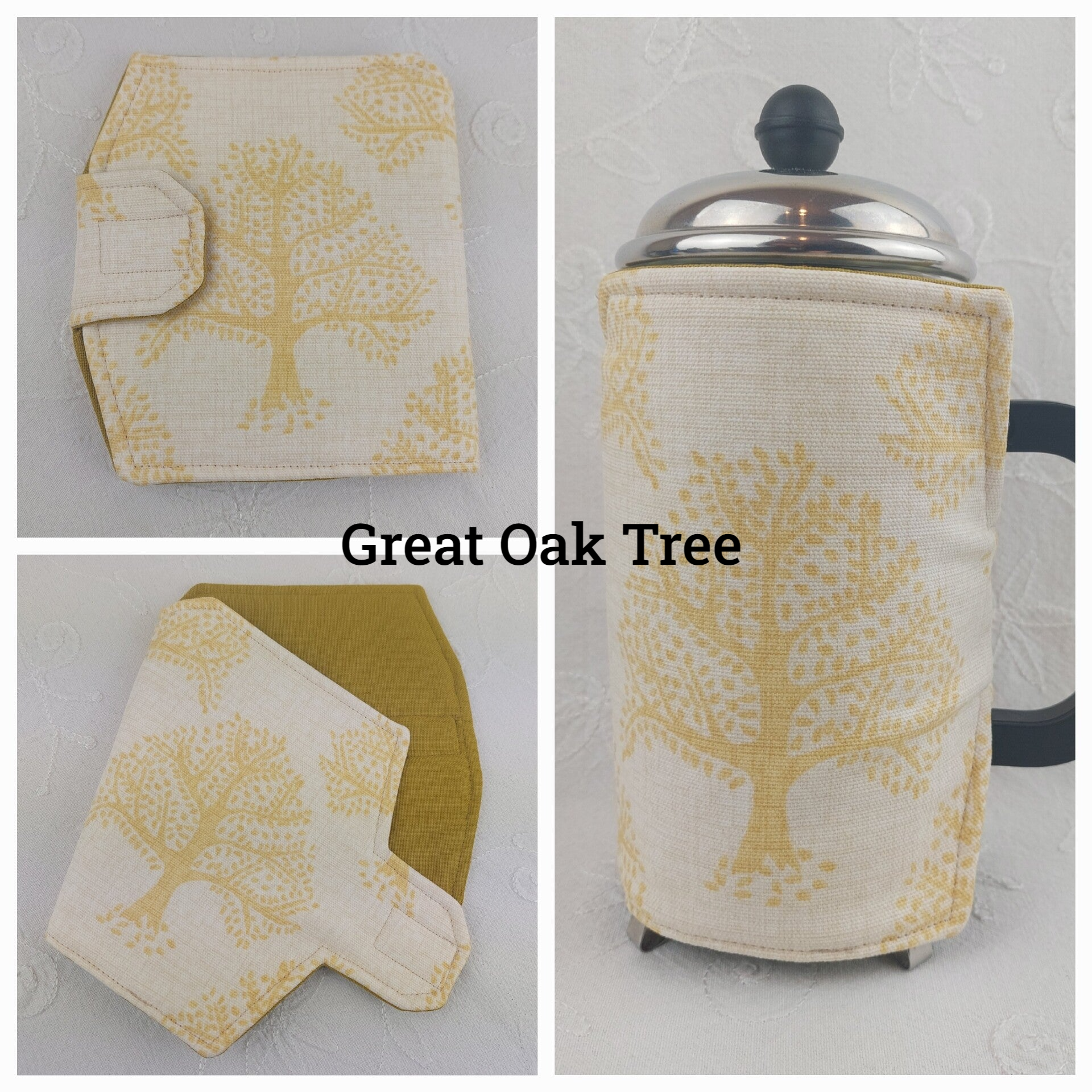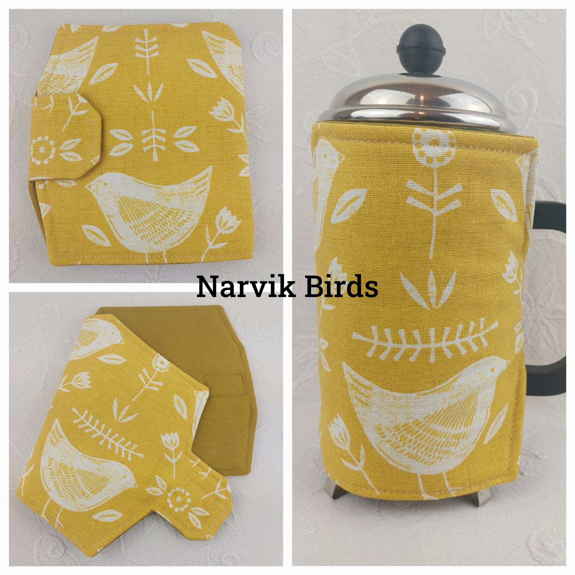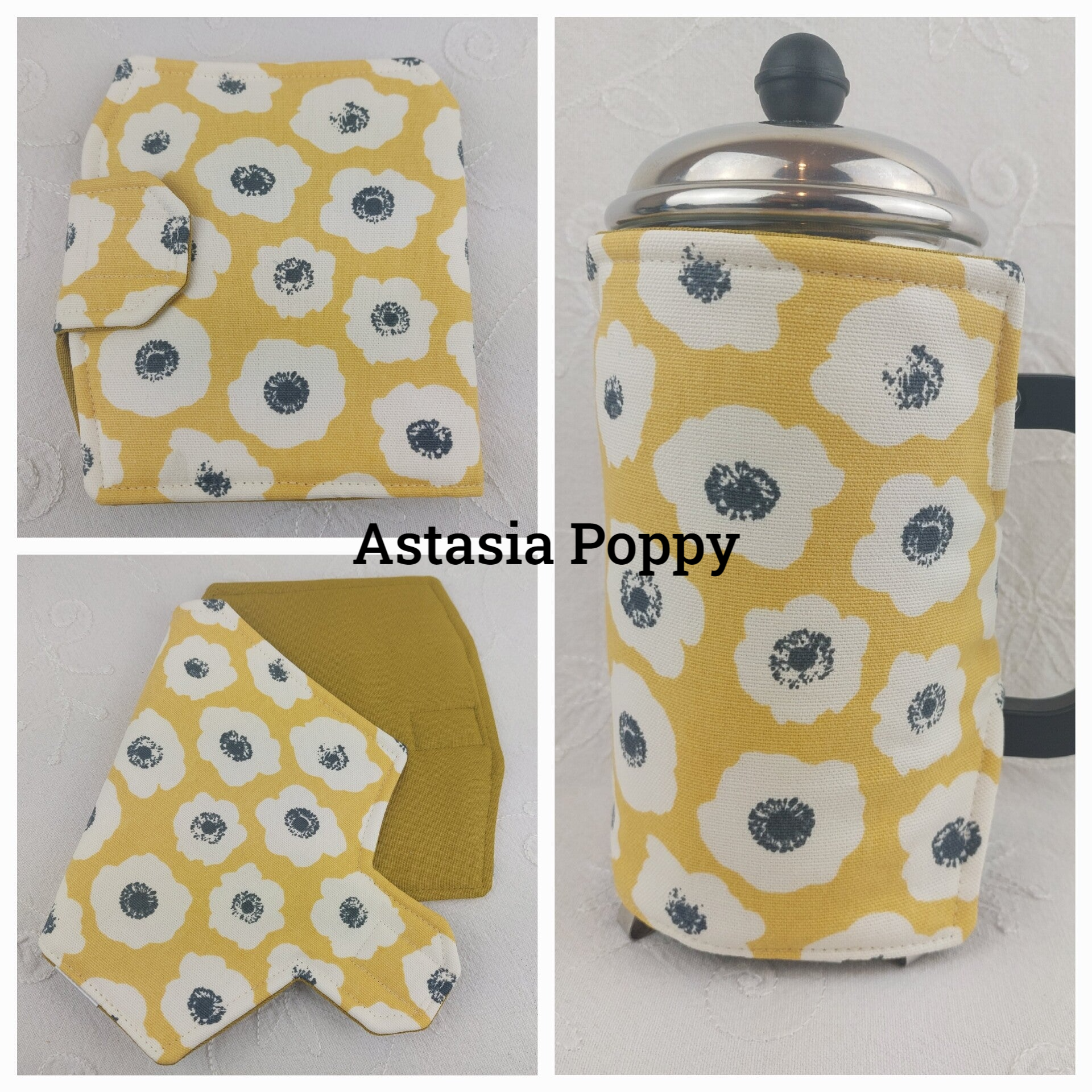 Yellow cafetiere cosy wrap-around jacket for French Press filter coffee makers. Cotton fabric outer, with thermal insulation wadding inside, and Velcro fastening tab for easy adjustment. A stylish kitchen, dining home décor accessory and a great gift idea.