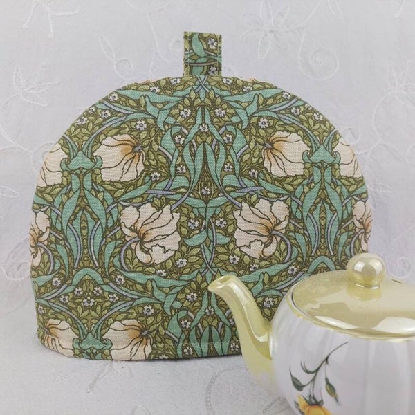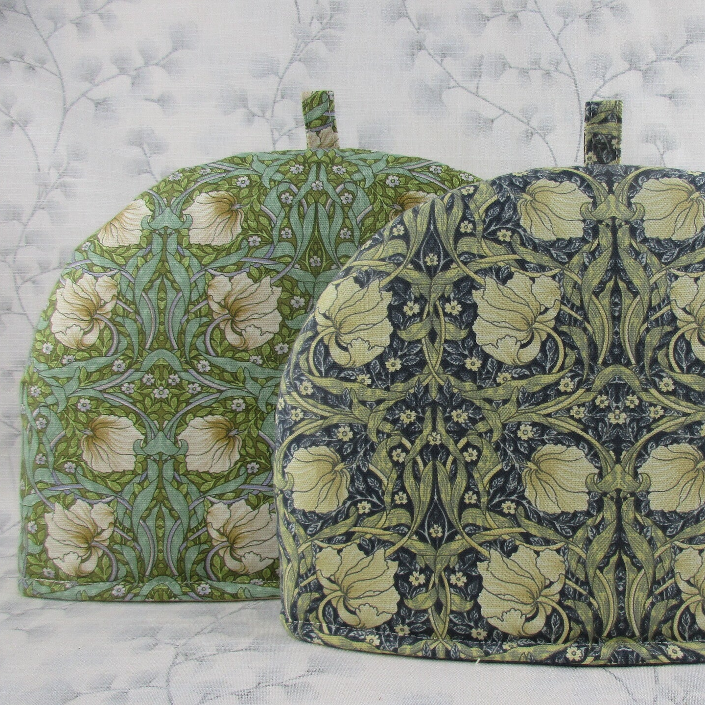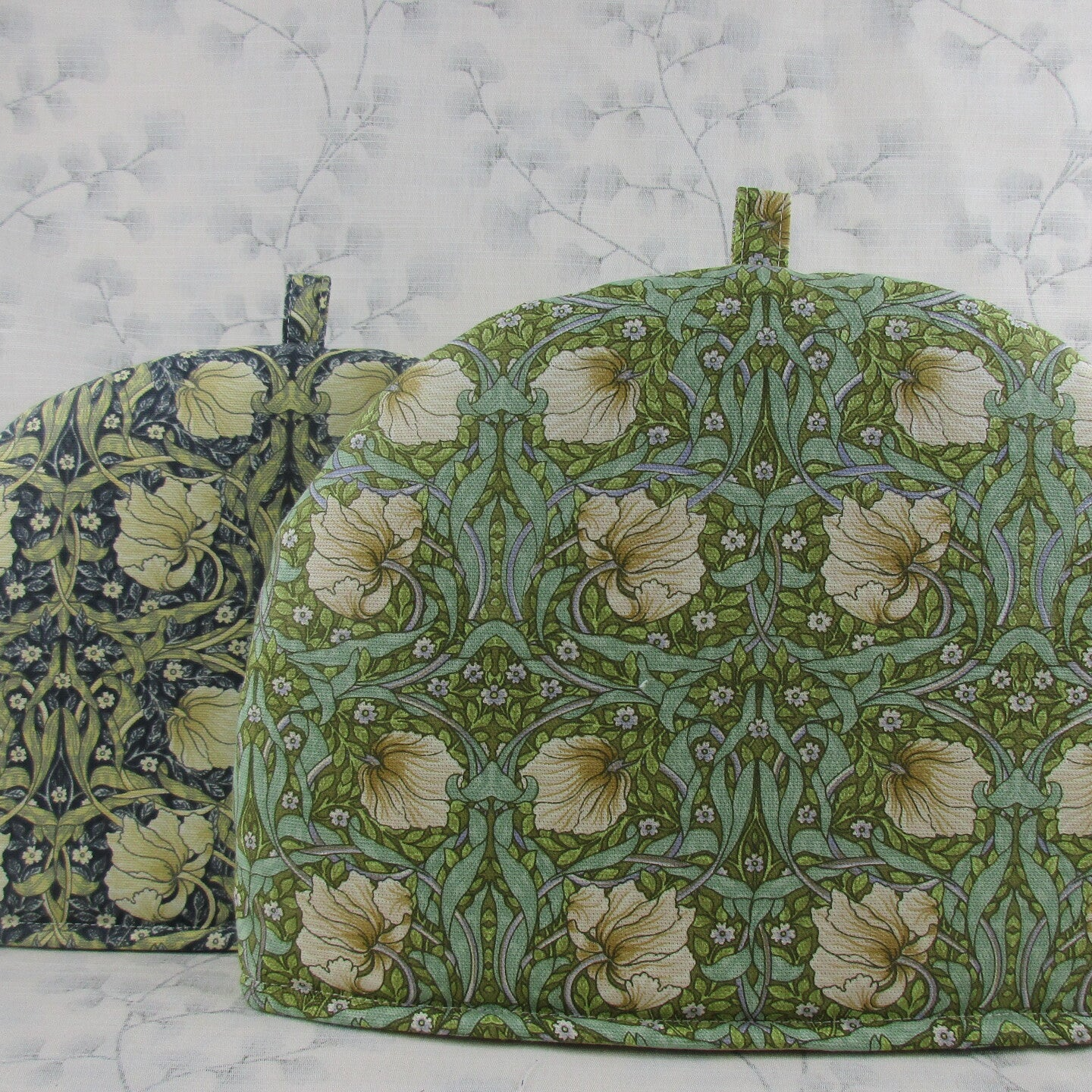 William Morris Fabric Tea Cosy. Pimpernel, first produced in 1876. With cotton lining and polyester insulation wadding inside to help keep your cuppa warm. Teapot cosies make great gifts and stylish cozy kitchen home decoration accessories.