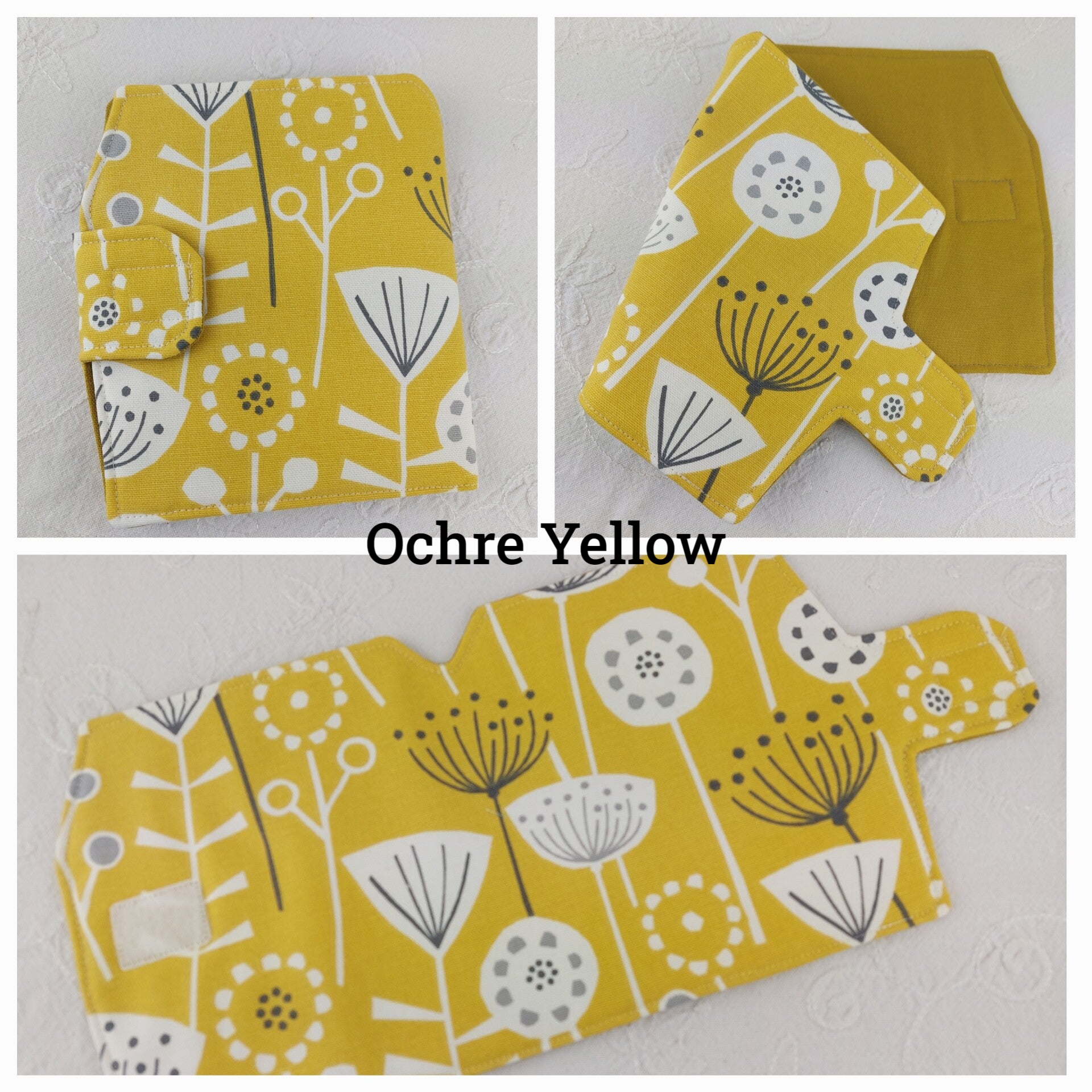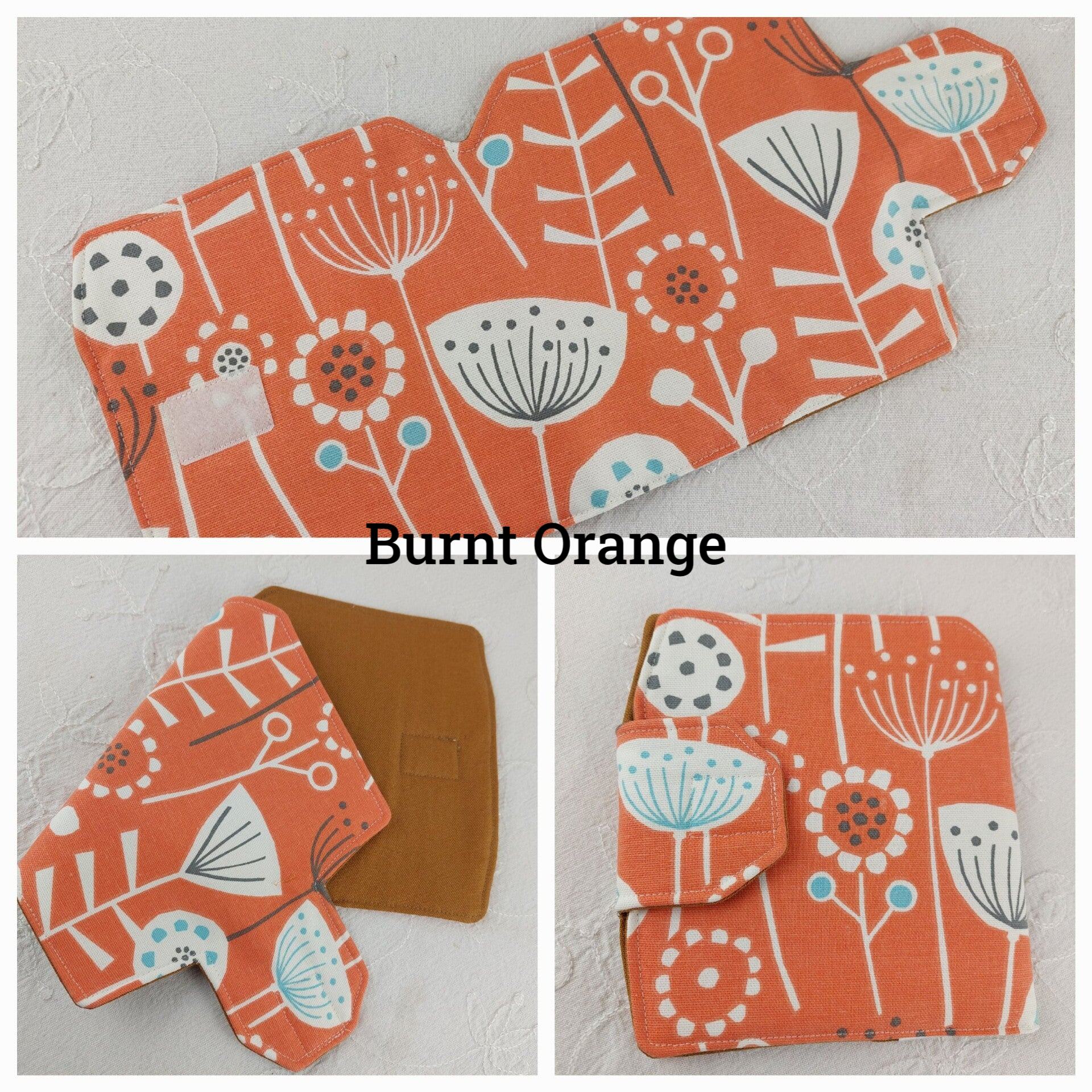 Burnt Orange, Blue, Seafoam, Ochre Yellow, Grey.