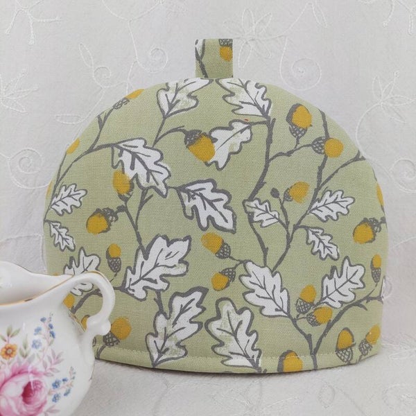 Oak Acorns design fabric Tea Cosy with cotton lining and polyester insulation wadding inside to help keep your cuppa warm. Our traditional country cottage style teapot cosies make great gifts and cozy kitchen home decoration accessories.