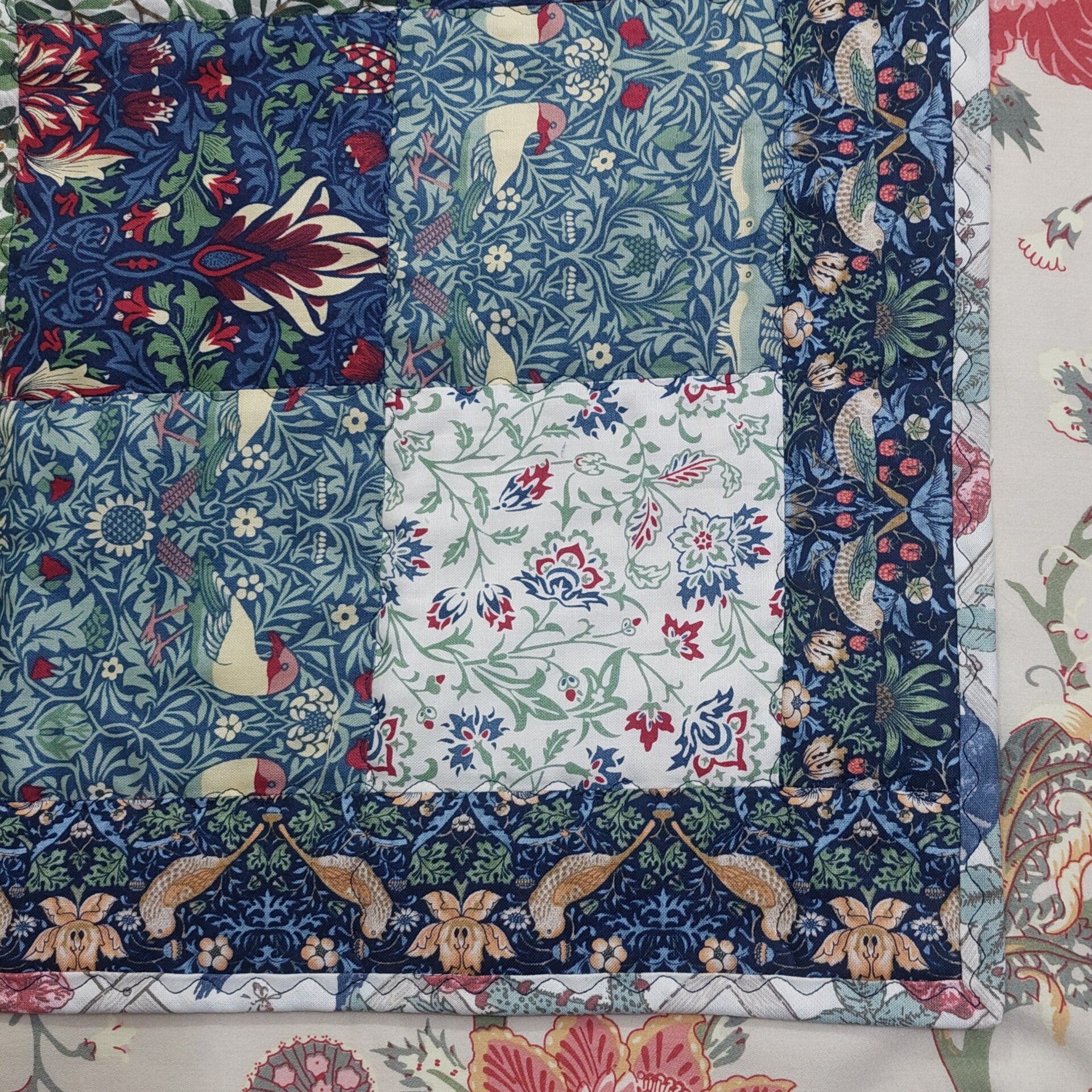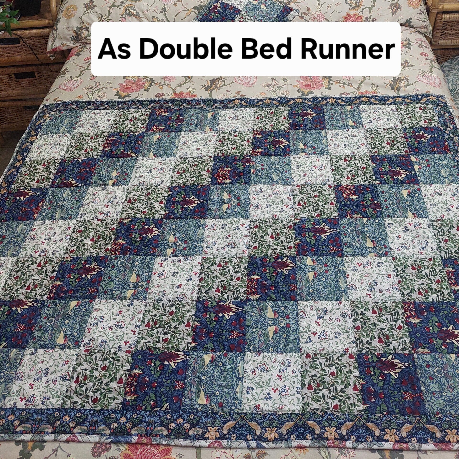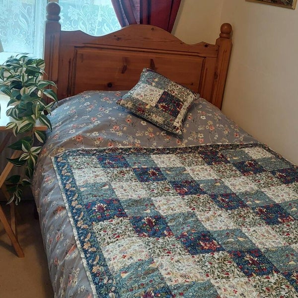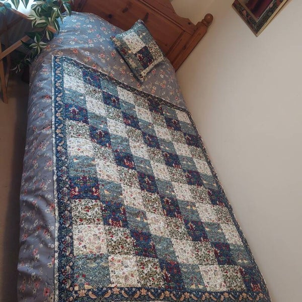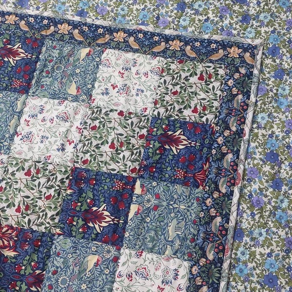 form this unique traditional style quilt. 100% Cotton patchwork squares, with Strawberry Thief border and bound with Trellis. Floral print cotton fabric on the reverse, and natural cotton batting middle layer.