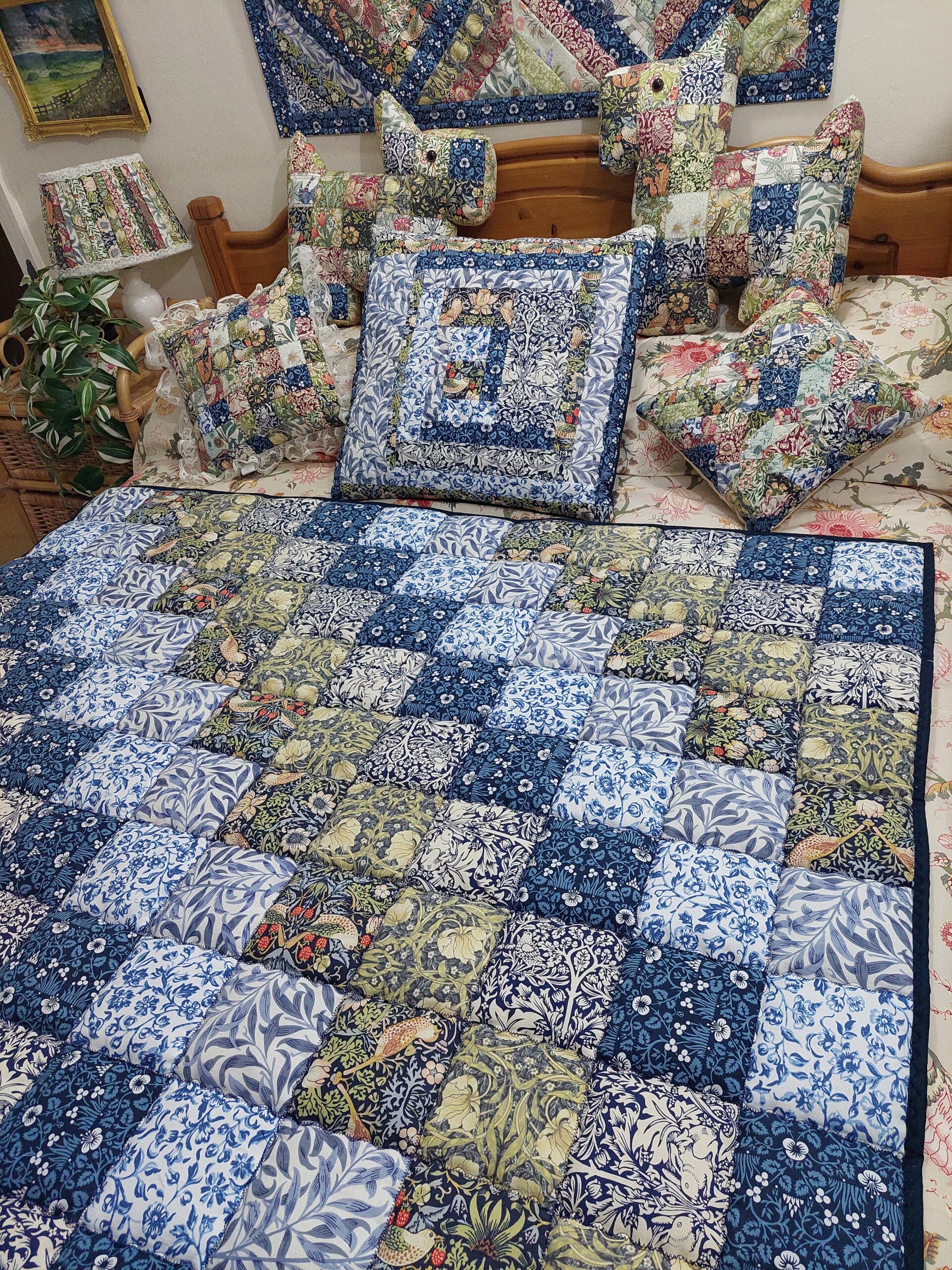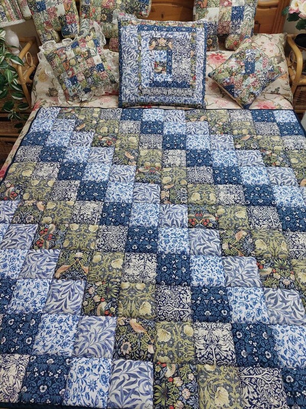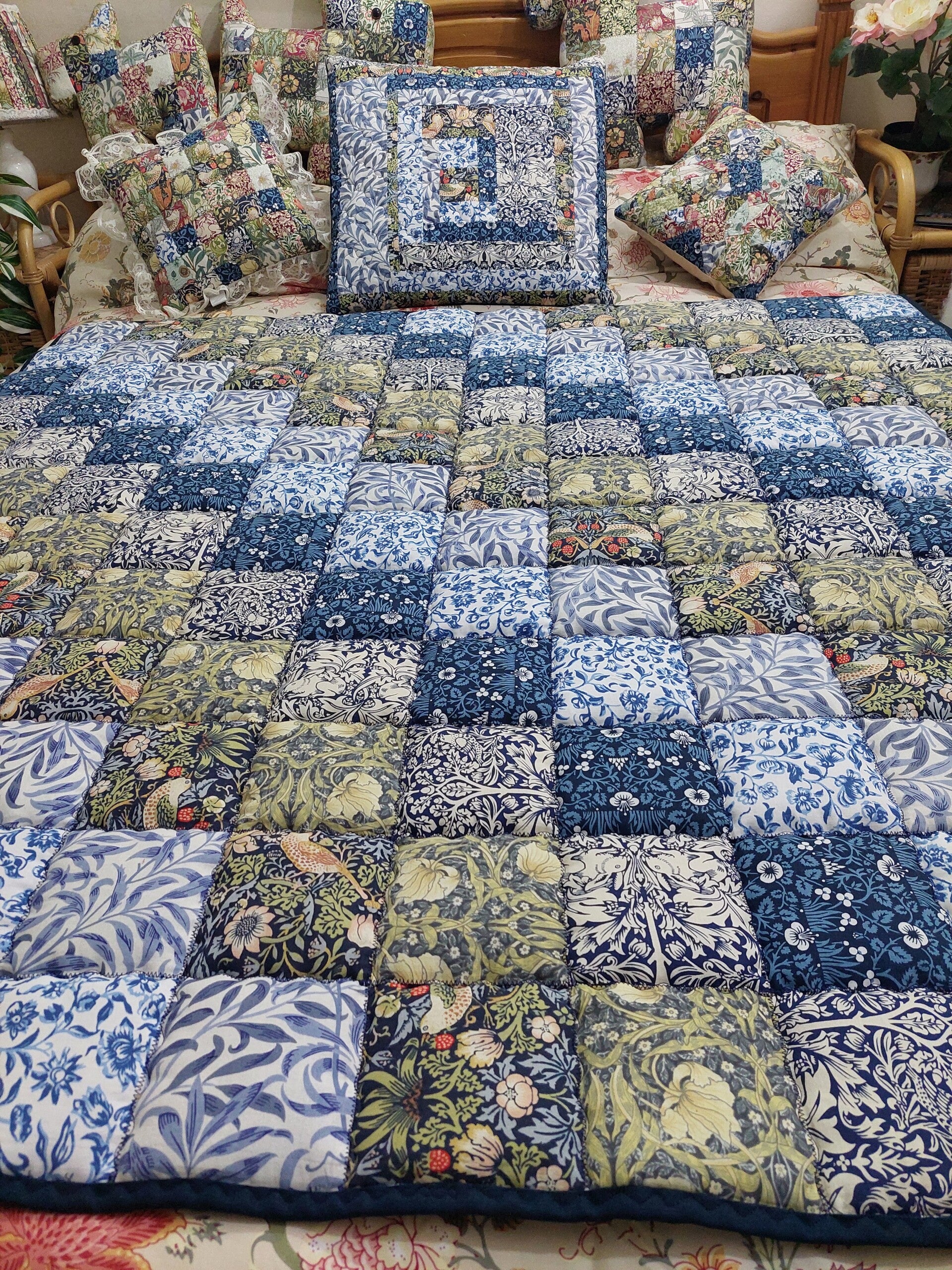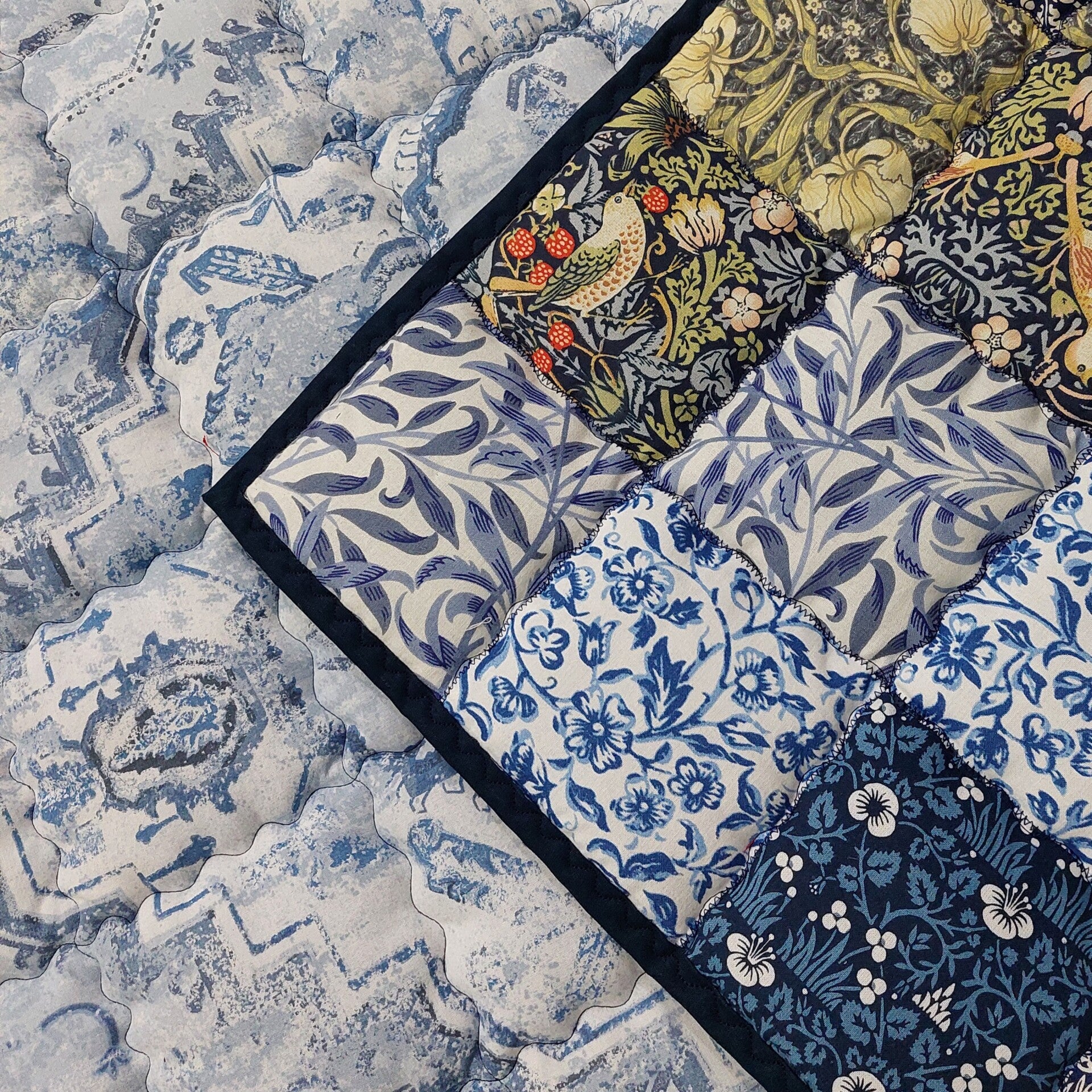 This unique handmade patchwork bed topper features six iconic William Morris blue themed designs: