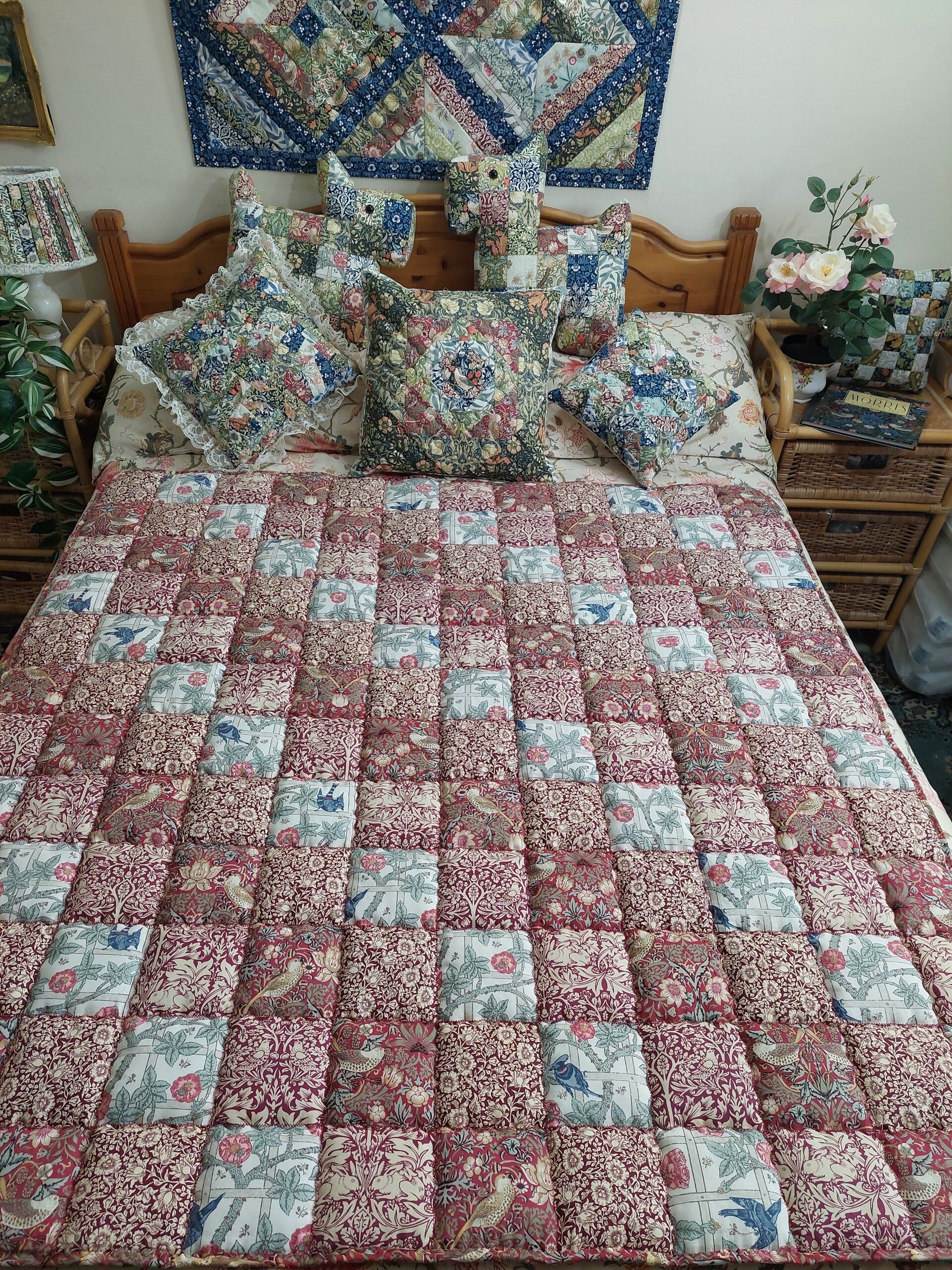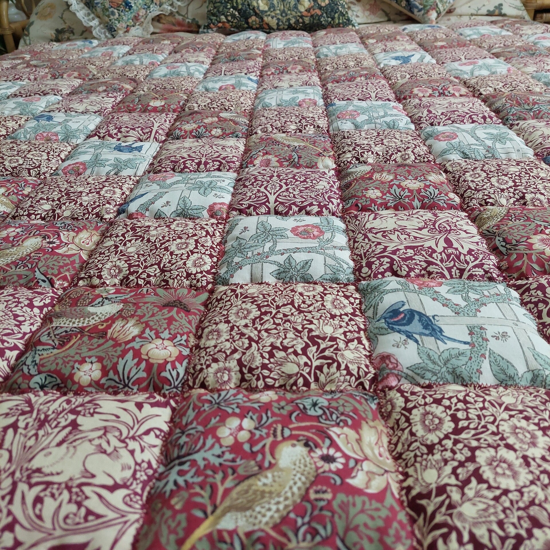 This unique handmade patchwork bed topper features four iconic William Morris Red themed designs: